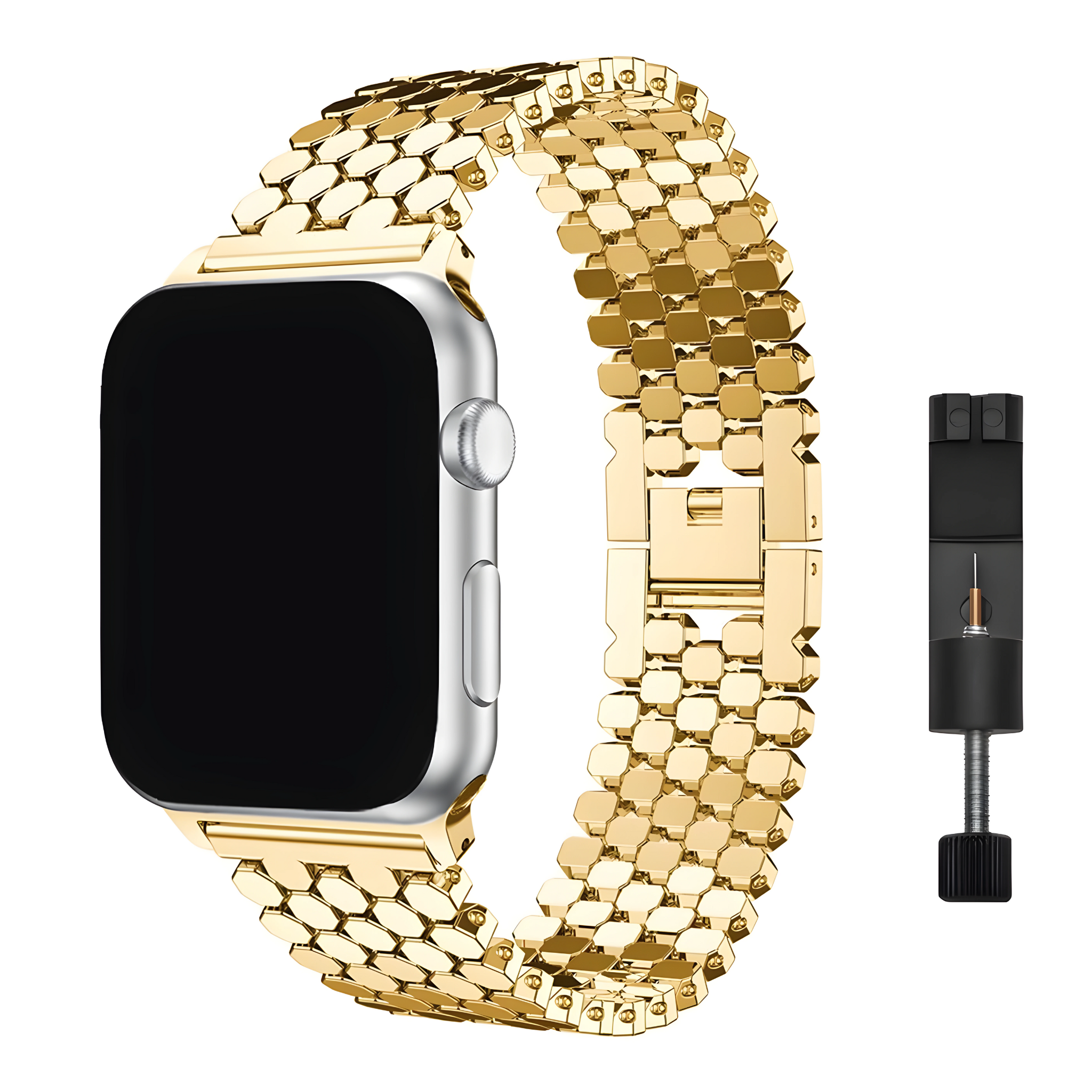 Het Innerlight® Hexagon+ Metalen bandje in Goud is geschikt voor de Apple Watch Series 1, 2, 3, 4, 5, 6, 7, 8, en 9 inclusief de SE-modellen. Het bandje heeft een breedte van 38, 40, of 41 mm en is gemaakt van roestvrijstaal (RVS), wat het duurzaam en stevig maakt. Het bandje heeft een schakel armband ontwerp, wat een elegante en stijlvolle uitstraling geeft aan je Apple Watch.