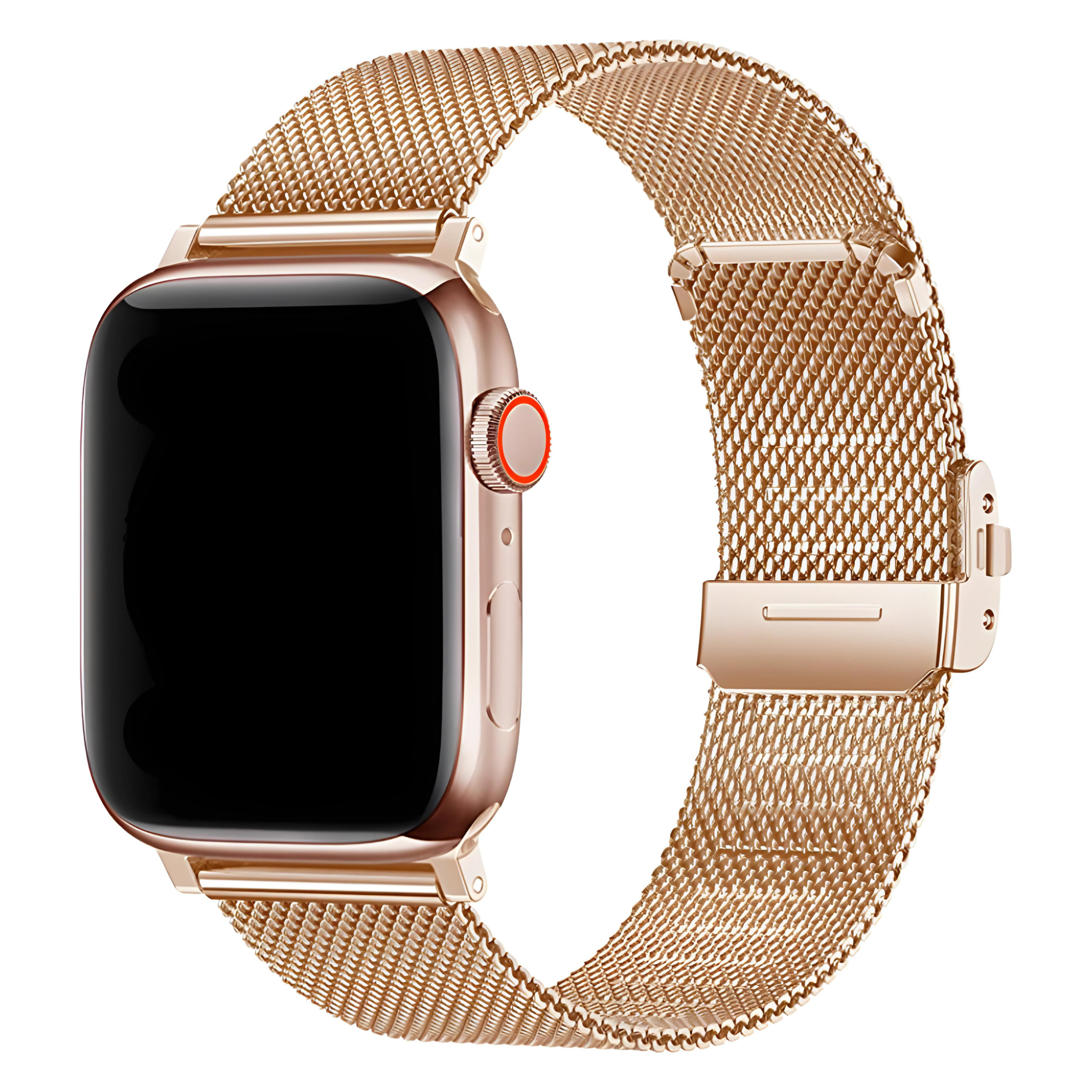 Het Innerlight® Milanese+ Milanees bandje in Rosé Goud is geschikt voor verschillende Apple Watch-modellen, waaronder Series 1, 2, 3, 4, 5, 6, 7, 8, 9, SE en Ultra. Het bandje heeft een breedte van 42, 44, 45 of 49 mm en is gemaakt van hoogwaardig roestvrij staal (RVS) met een luxe sluiting.