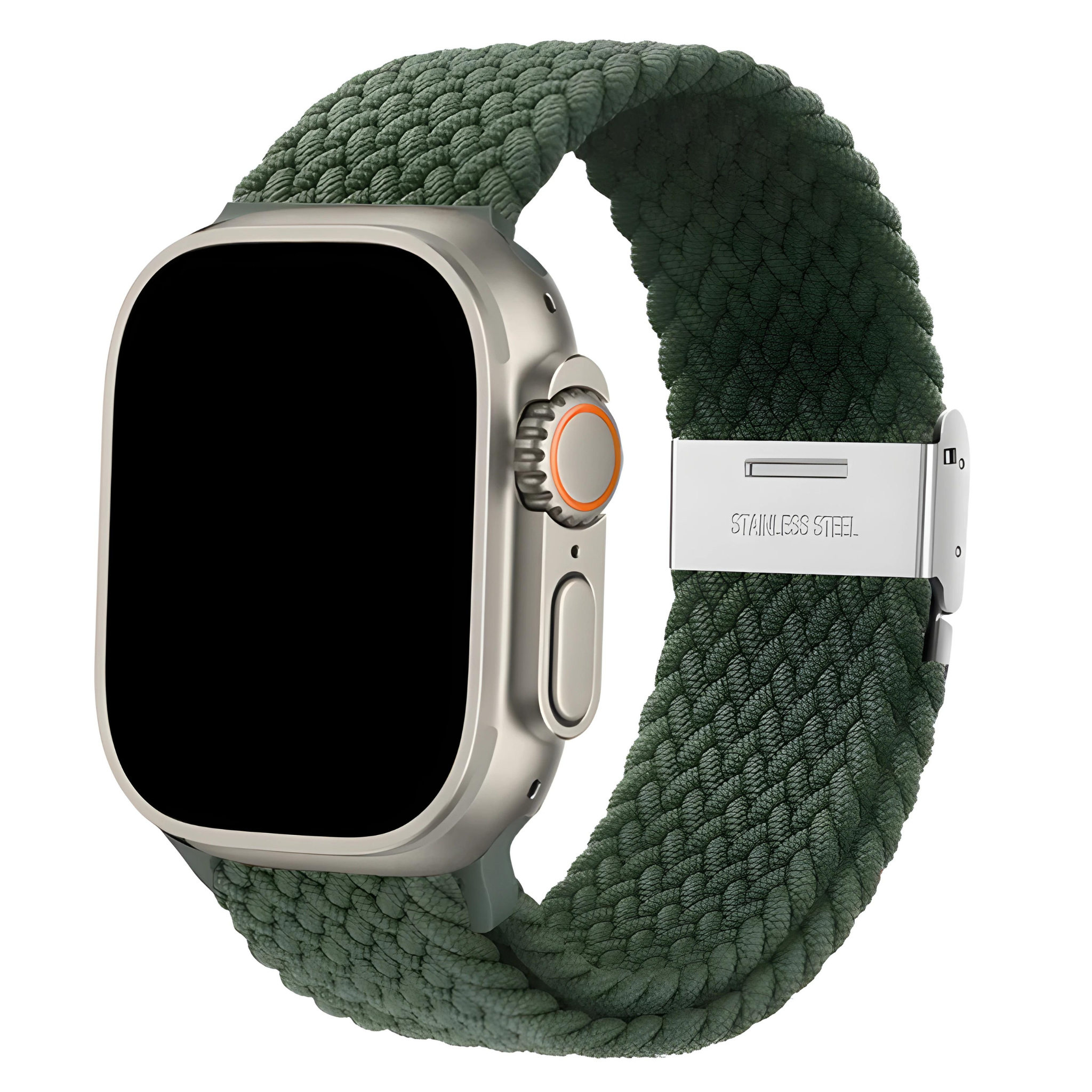 Het Innerlight® Nylon+ bandje in Nylon Groen Geweven is geschikt voor de Apple Watch Series 1, 2, 3, 4, 5, 6, 7, 8, 9 en SE. Het bandje heeft een breedte van 38, 40 of 41 mm en is gemaakt van hoogwaardig nylon materiaal met een stijlvol geweven patroon.