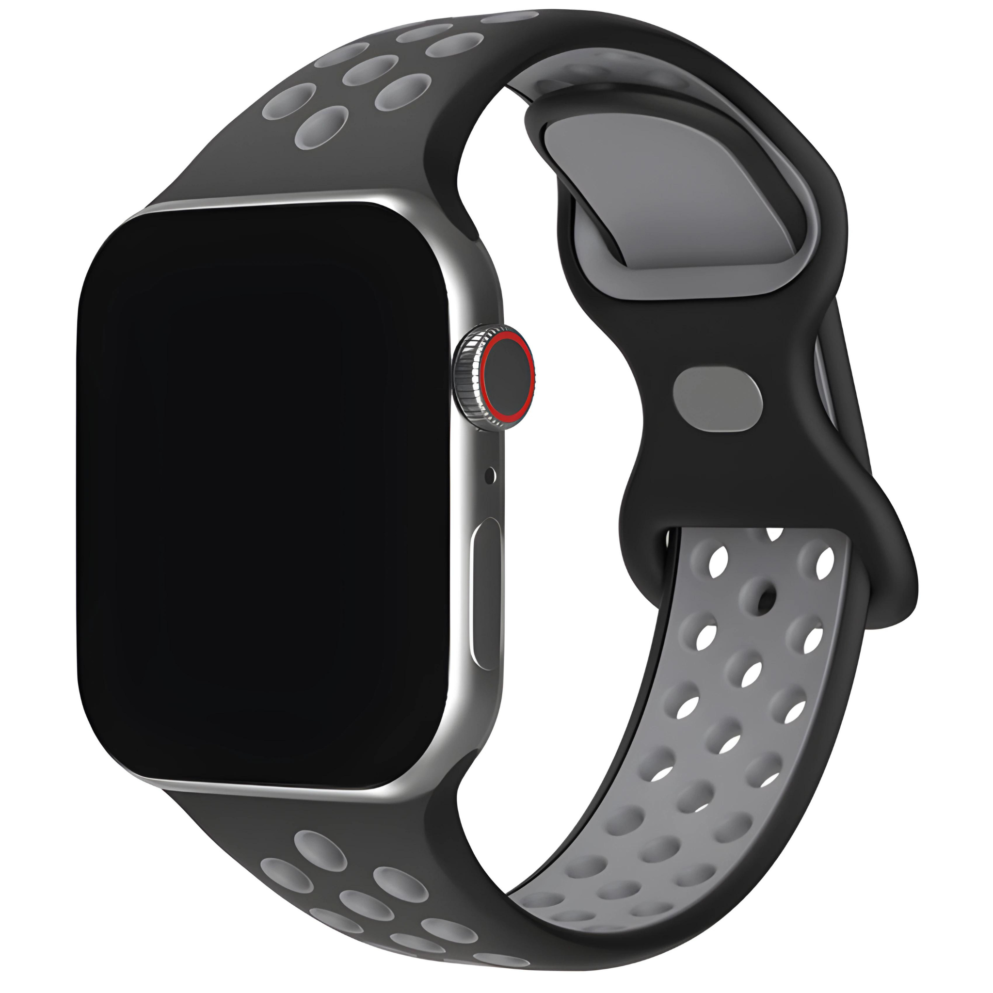 Het Innerlight® Sport+ Siliconen Bandje in de kleur Zwart Grijs is geschikt voor de Apple Watch Series 1, 2, 3, 4, 5, 6, 7, 8, SE en Ultra modellen. Het bandje heeft een breedte van 42, 44, 45 of 49 mm en is voorzien van een OneSize-pasvorm, waardoor het geschikt is voor verschillende polsmaten.