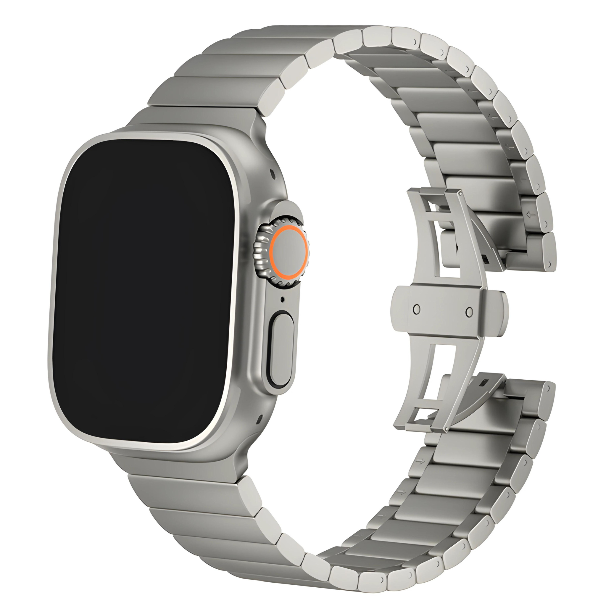 2. Vlindersluiting Schakel Armband: De vlindersluiting zorgt voor een moeiteloze bevestiging en een veilige pasvorm om je pols. Het schakelontwerp voegt een vleugje elegantie toe aan je Apple Watch.