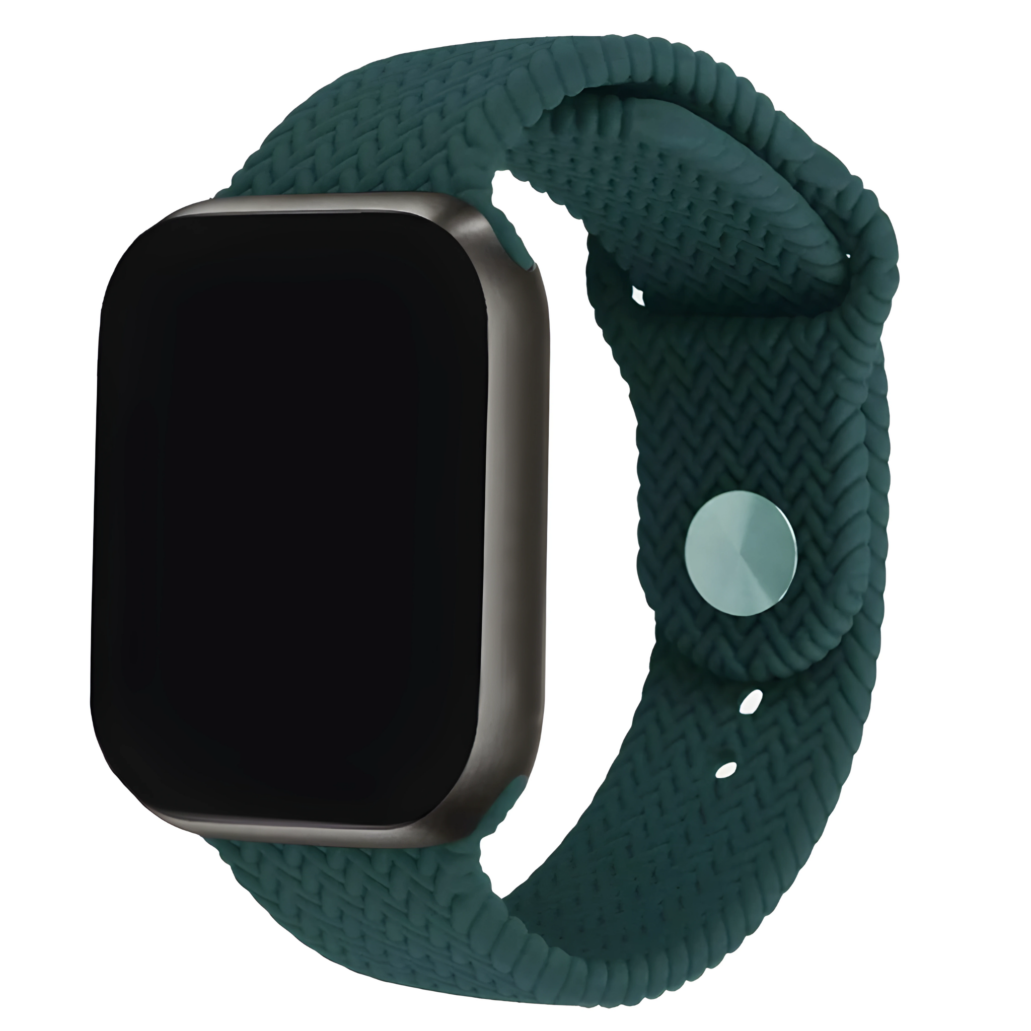 Het Innerlight® Woven+ siliconen bandje in de kleur Groen Geweven is geschikt voor verschillende Apple Watch-modellen, waaronder Series 1, 2, 3, 4, 5, 6, 7, 8, 9 en SE. Het bandje heeft een breedte van 38, 40 of 41 mm en is gemaakt van hoogwaardig siliconen materiaal met een geweven patroon.